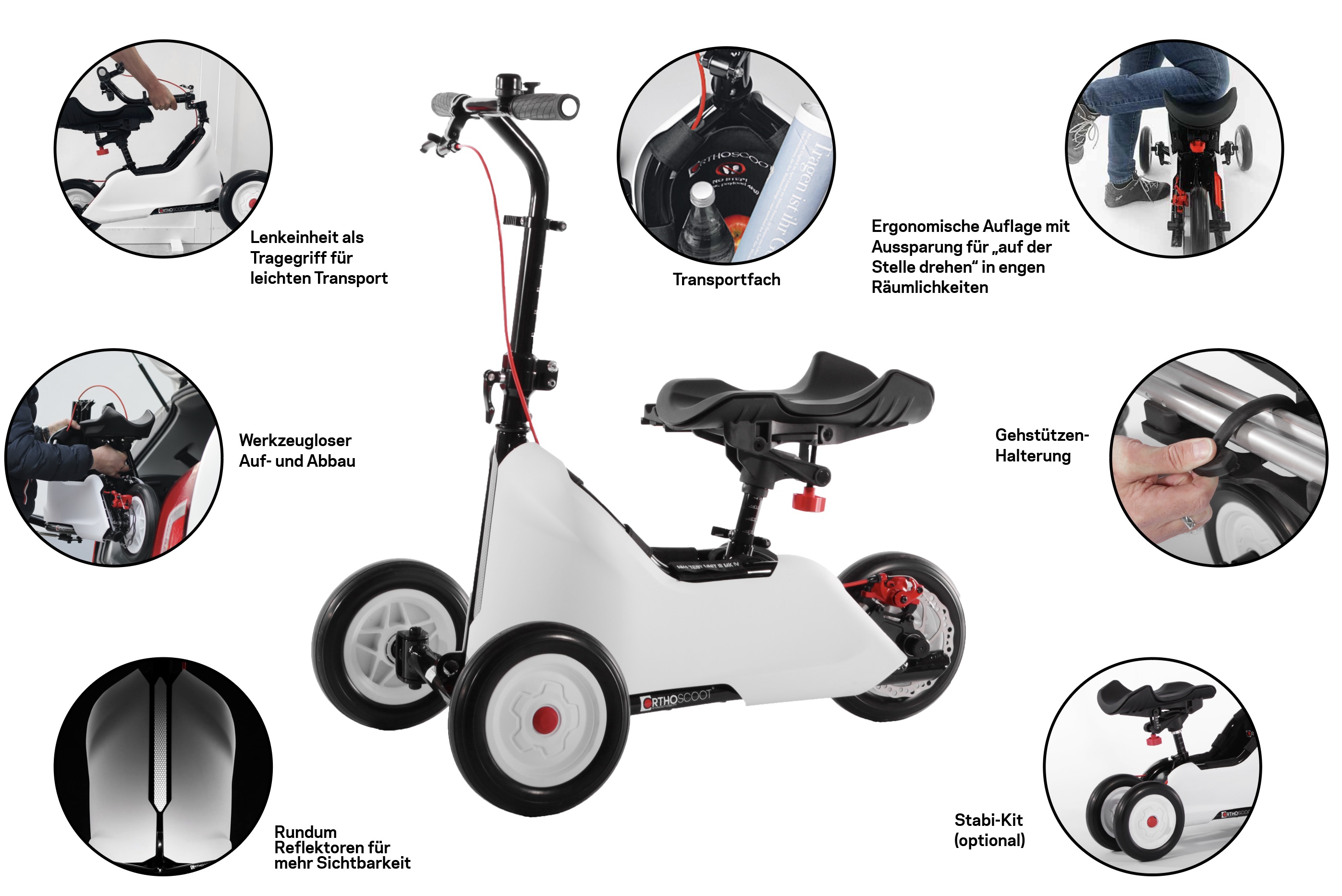 Mit wenigen Handgriffen und werkzeuglos lässt sich der ORTHOSCOOT® zügig auf- bzw. abbauen. Das Gewicht des ORTHOSCOOT® ist vergleichbar mit dem eines kleinen Fahrrads. Das Hilfsmittel kann somit problemlos von jeder Altersgruppe bspw. in den Kofferraum eingeladen werden.
